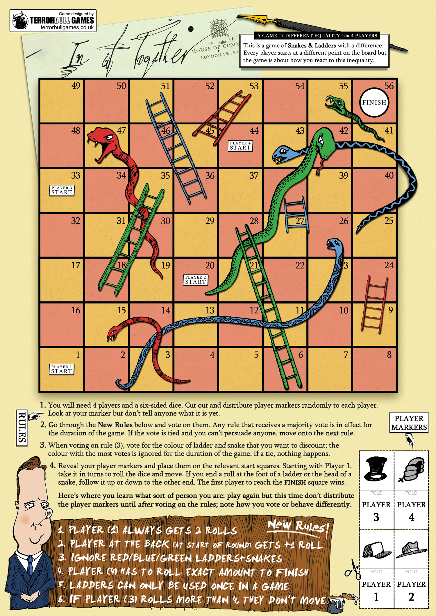 In It Together was commissioned by the Loco Comedy Film Festival at the BFI Southbank as a fully playable game printed in their 2015 festival programme. The theme of the festival was "class", so we devised a rather unfair variant on snakes & ladders that invites players to try and make it better. But do they?