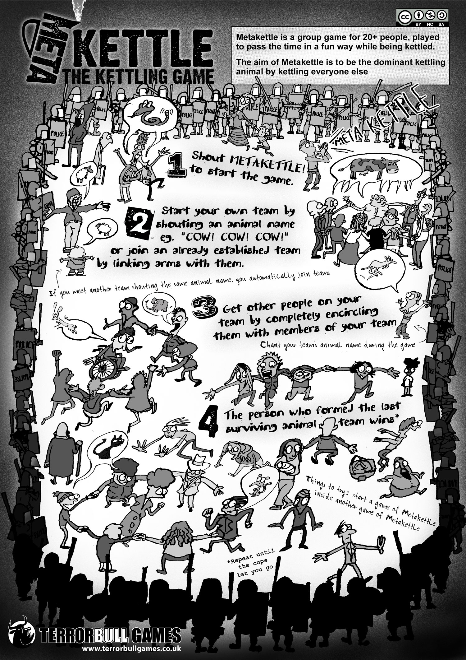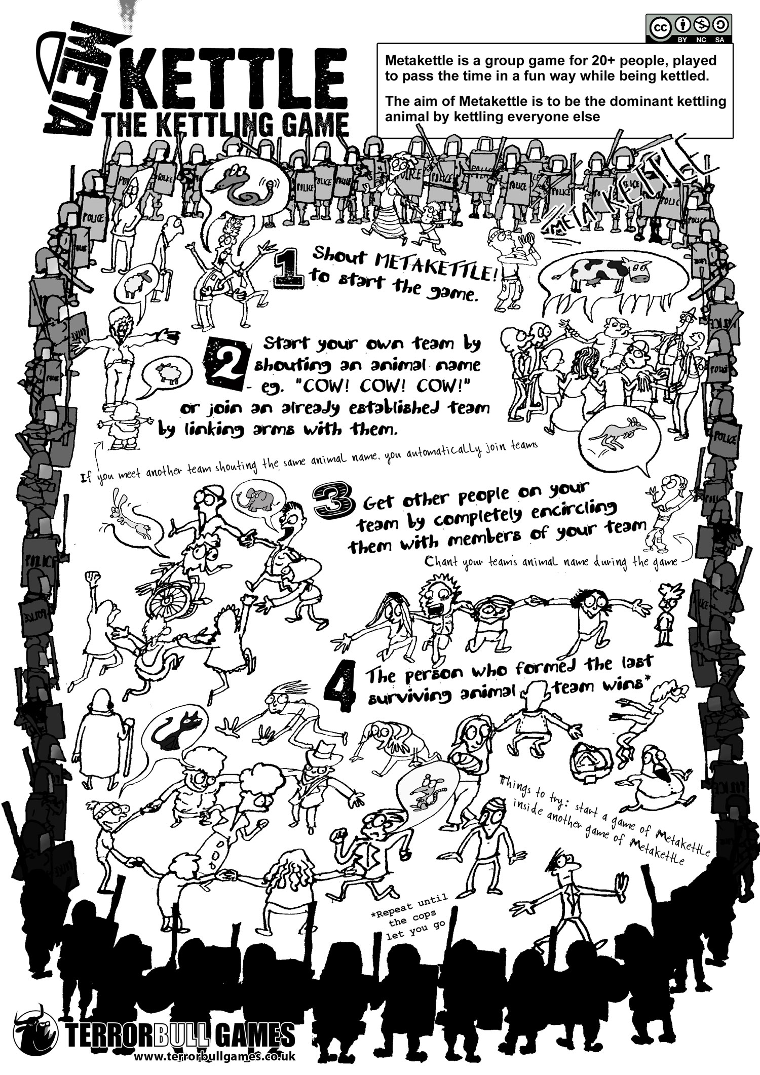 "METAKETTLE IS A GROUP GAME for 20+ people, played to pass the time while being kettled. The aim of Metakettle is to be the dominant kettling animal by kettling everyone else."