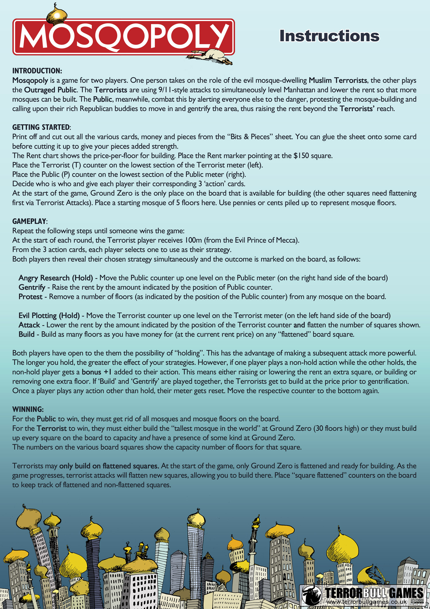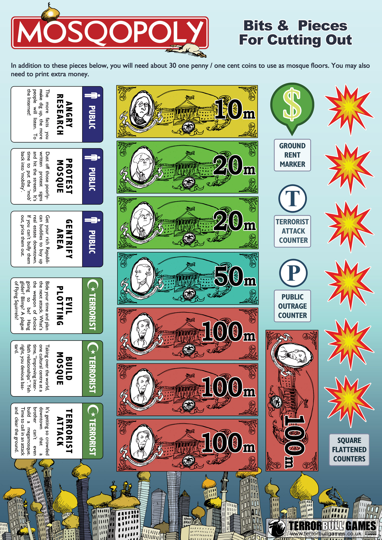 Following the craziness surrounding the 'Ground Zero Mosque', we decided to make another print-and-play game. You know what they say, ridicule is the third-best weapon against ignorance; vigilance and education being the first two (strangely, Wikipedia has the AK-47 listed as #4).