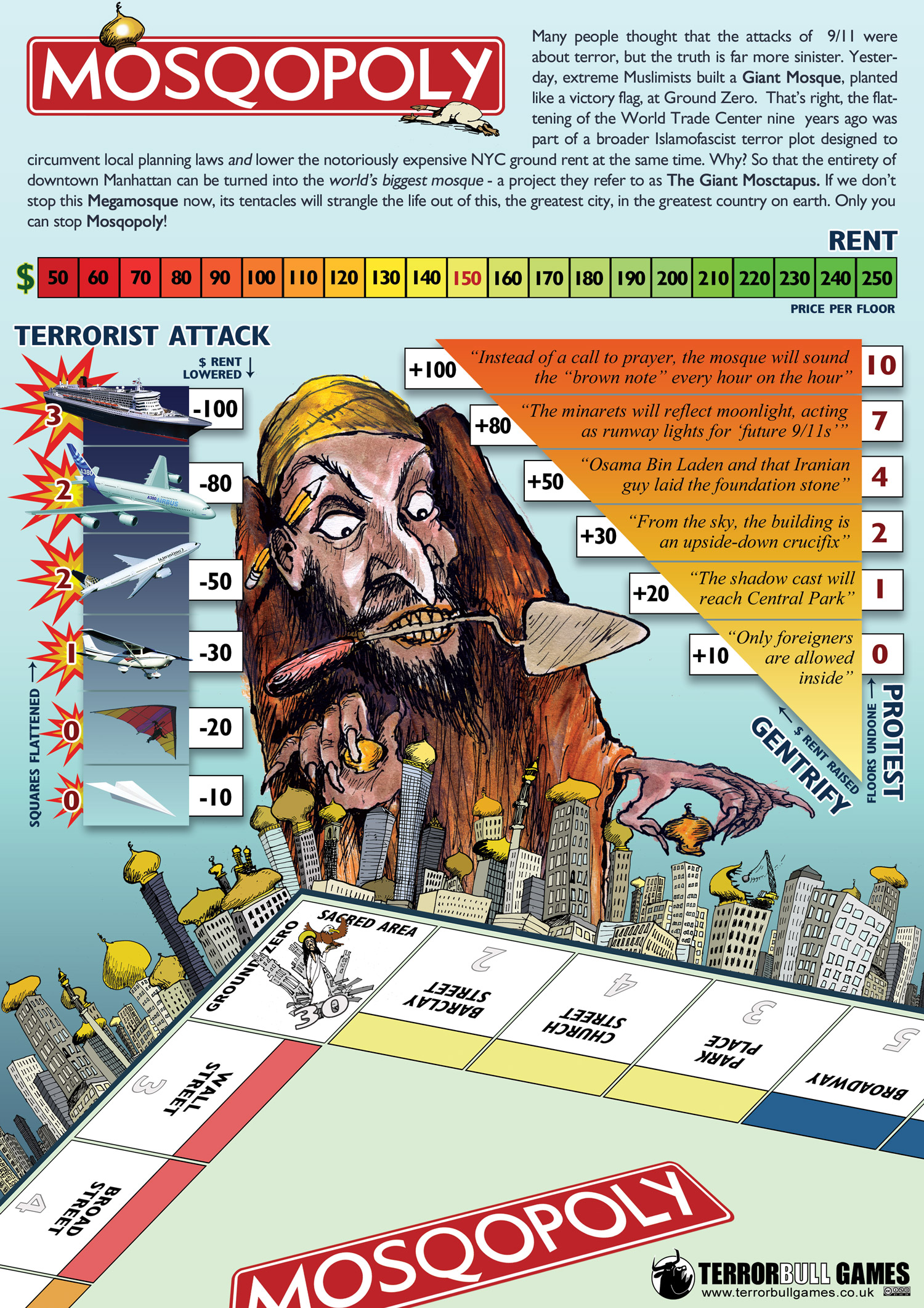 "Many people thought the attacks of 9/11 were about terror, but the truth is far more sinister. Yesterday, extreme Muslimists built a Giant Mosque, planted like a victory flag, at Ground Zero. That's right, the flattening of the World Trade Center nine years ago was part of a broader Islamofacist terror plot designed to circumvent local planning laws and lower the notoriously expensive NYC ground rent at the same time. Why? So that the entirety of downtown Manhattan can be turned into the world's biggest mosque - a project they refer to as The Giant Mosqtapus. If we don't stop this Megamosque now, it's tentacles will strangle the life out of this, the greatest city, in the greatest country on earth. Only you can stop Mosqopoly!"